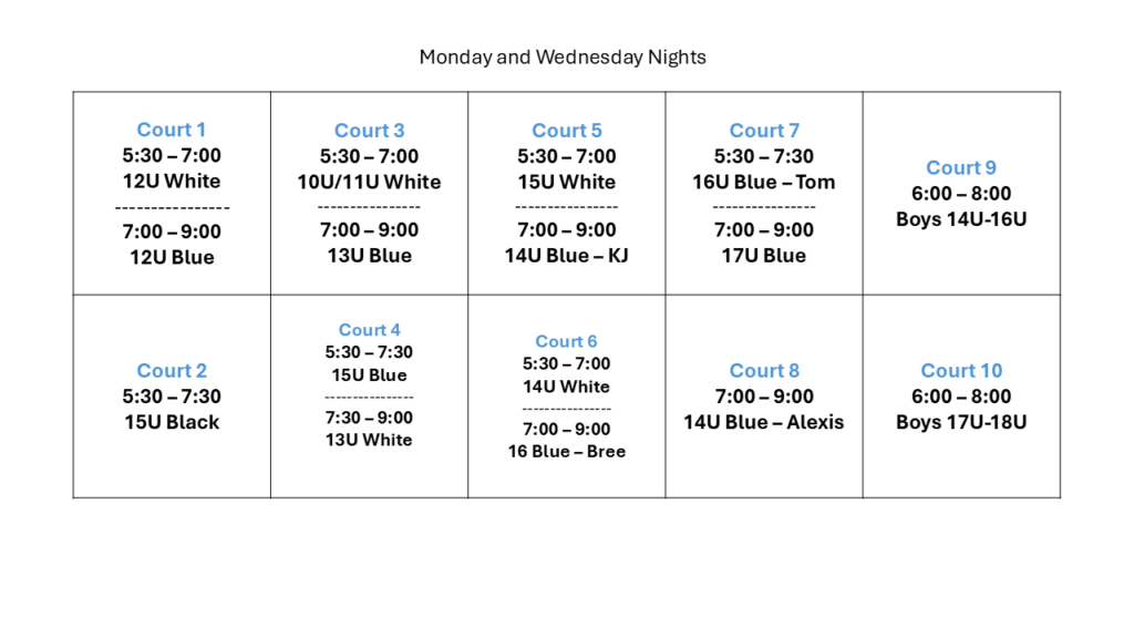 Black teams will have their first tournament in December and will have 1-2 tournaments a month, ending in June with AAU and/or USAV Nationals. Tournaments will be 2- to 3-day events, and several will be USAV qualifiers.