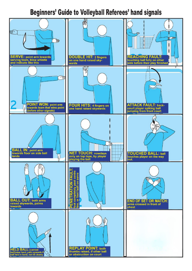 - No doubt many calls by the officials are subjective. Understanding the game and calls makes for a much more enjoyable experience. You can find USA Volleyball Officials’ Hand Signals for indoor volleyball above.